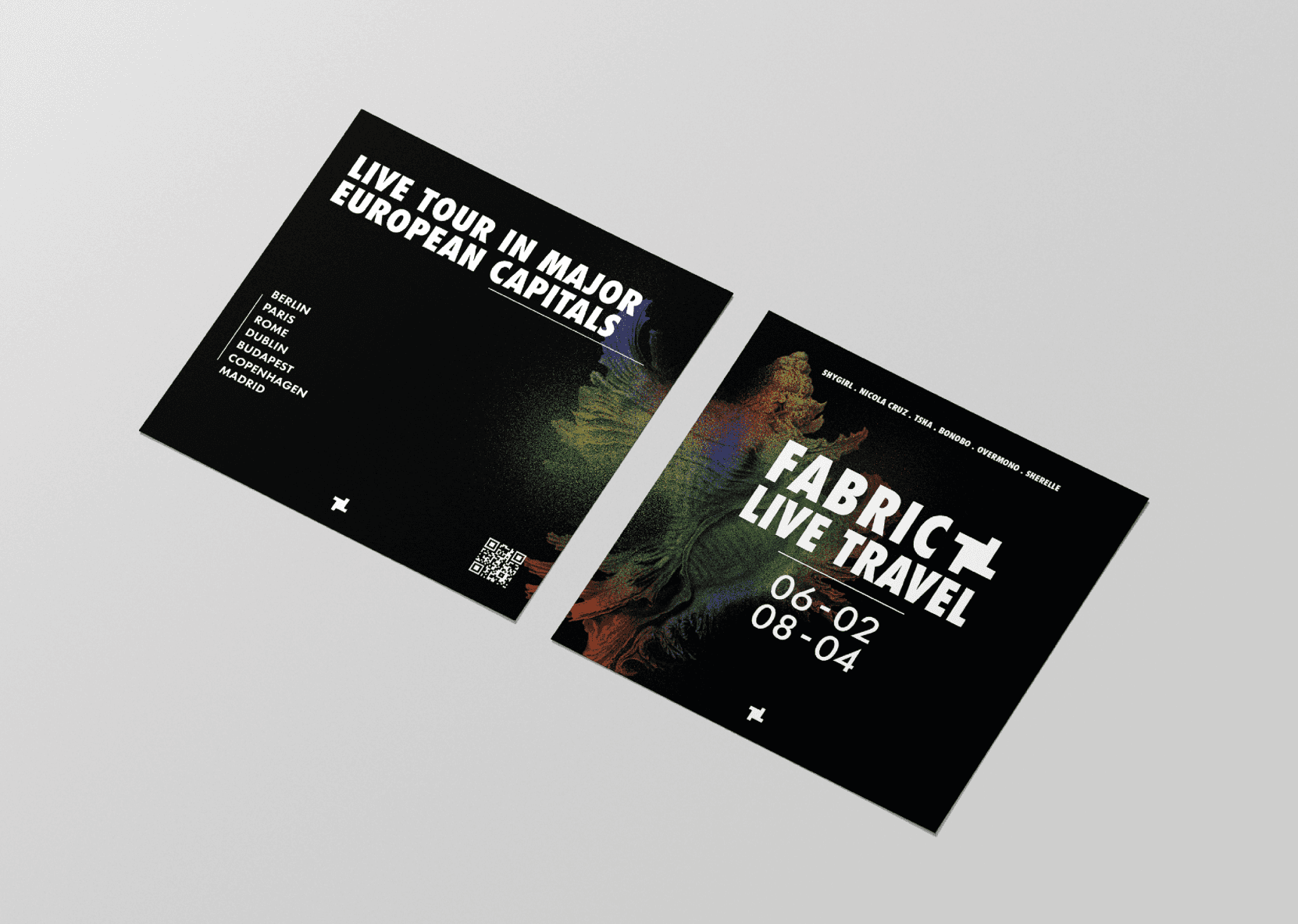 Le club londonien “Fabric” organise un tour Live dans les grandes capitales Européennes. Ce tour durera 2 mois et s‘intitule “Fabric Live Travel”. Je devais organiser une communication globale sur cet évènement culturel. La mission Fabric a pour habitude de détourner le travail d'artistes majeurs pour réaliser leurs pochettes de disques (une centaine à ce jour). Il m’était demandé de réaliser la communication de cet évènement en gardant ce concept. Je devais proposer, un flyer, une affiche, des idées de communication plurimédia, des supports de street marketing et goodies. Une fois mes recherches réalisées et mon axe de communication établi, je devais passer à la réalisation informatique des supports proposés.
