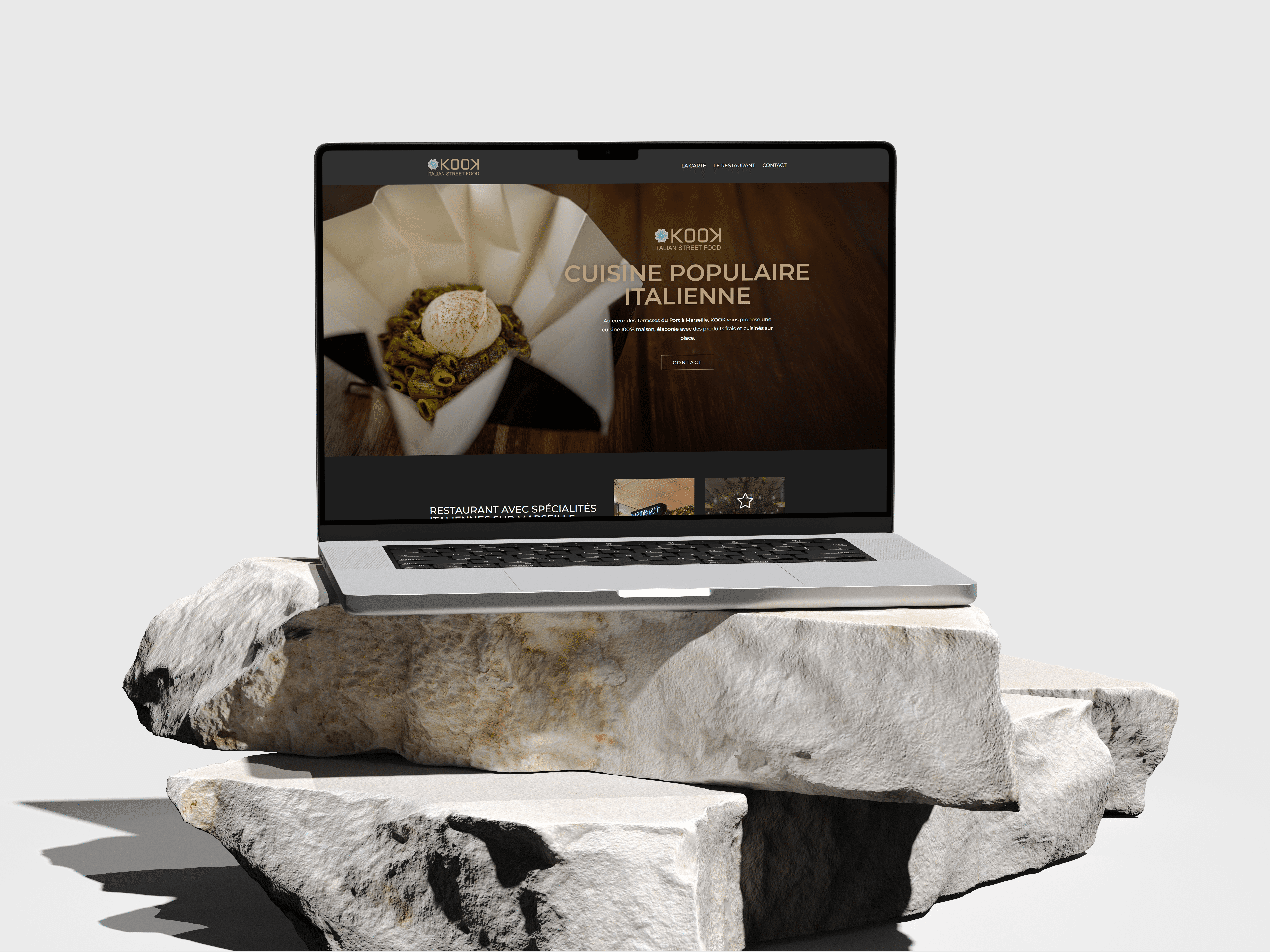 Refonte du site web de Kook Italian Street Food, un restaurant italien situé aux Terrasses du Port. À partir des photos fournies par le client, j’ai repensé leur intégration sur le site afin d’améliorer la lisibilité et l’esthétique globale. J’ai également redessiné l’ensemble des icônes pour une identité plus cohérente et moderne. Le site a été conçu en responsive design, garantissant une expérience optimale sur ordinateur, tablette et mobile. Enfin, j’ai assuré la prise en main du site par le client en lui expliquant rapidement le fonctionnement de WordPress pour une gestion autonome du contenu.